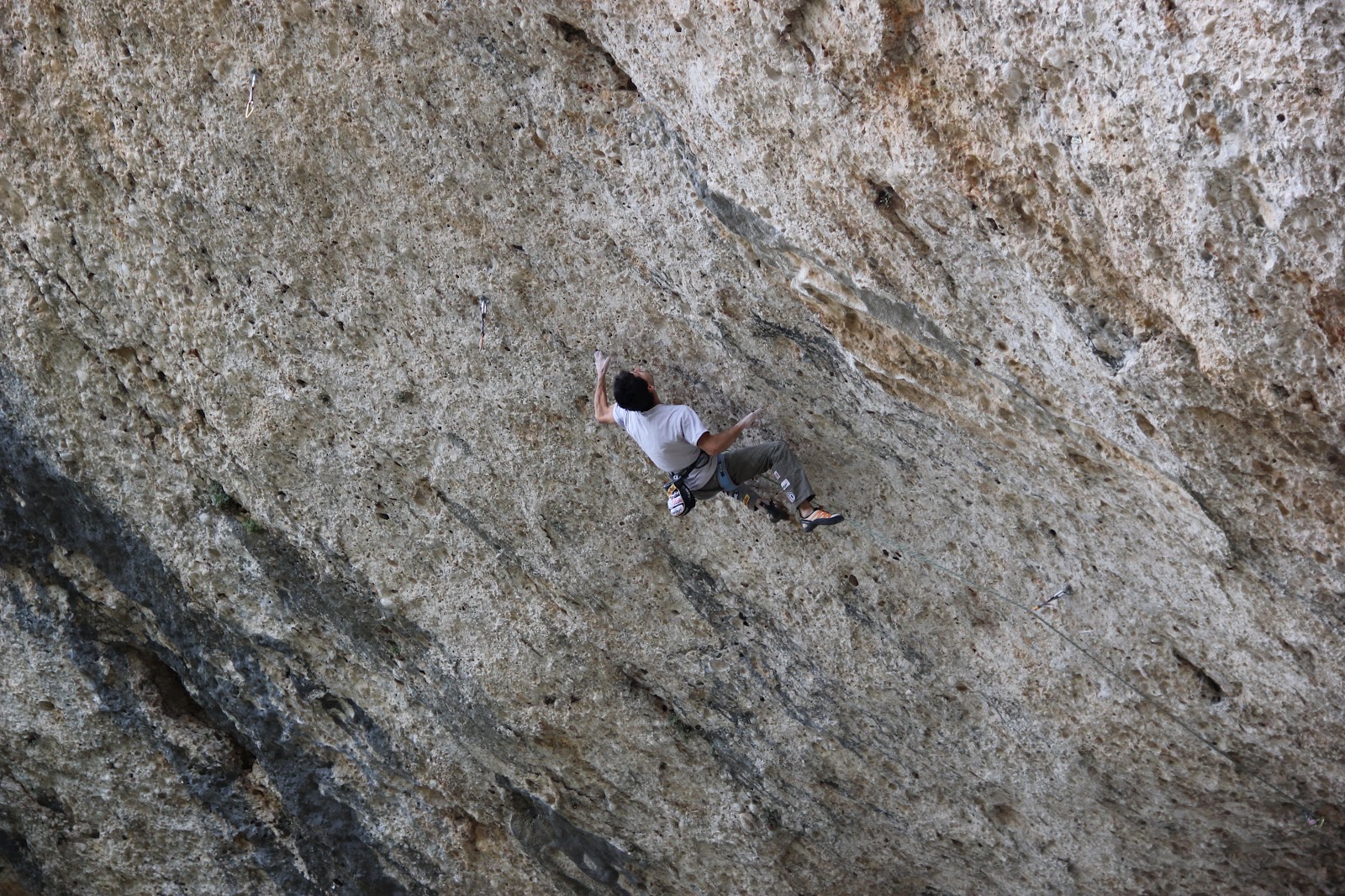 "Nit de bruixes" ou comment tirer très fort sur des demi phalanges dans un toit. Cette voie impressionnante remonte les trous d'un dévers bien prononcé... Elle exige une force exceptionnelle dans les doigts.